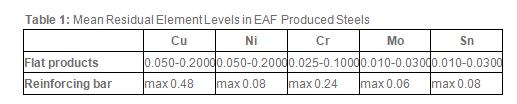 As far as flat products and reinforcing bars are concerned, Table 1 shows typical values of main residual elements for the EAF route, in wt%.