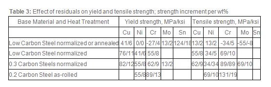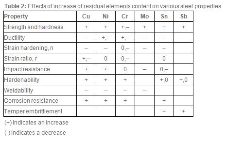 Although the effect of residuals on properties may be quite small, sometimes even a small change in some property can significantly increase the rejection rate of products with specified requirements. The general consensus about effects of residuals such as Cu, Ni, Cr, Mo, Sn and Sb on various steel properties is given in Table 2.